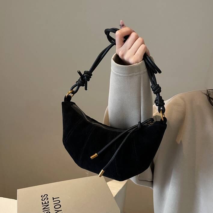 ミニマルながらも洗練された印象を与える、今季トレンドの三日月型ショルダーバッグ
