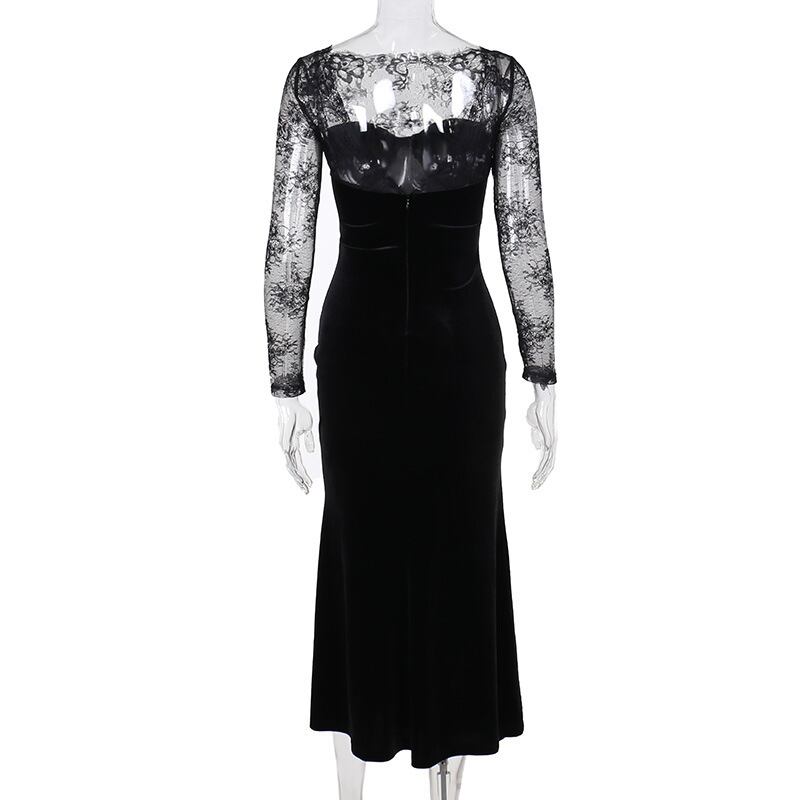 ベロア ロングドレス 黒 レース スリーブ シースルー レディース 上品 高級感 エレガント フォーマル マーメイドライン タイトドレス 韓国風 ワンピース 結婚式 二次会 披露宴 デート 20代 30代 40代 秋 冬 春 パーティー 発表会 お呼ばれ シースルー 長袖 美シルエット 着痩せ 高見え ブラック C-OSS0140