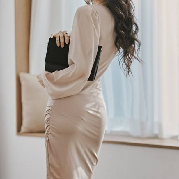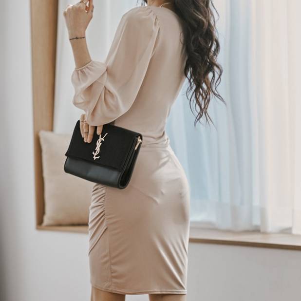 シフォン スリーブ ワンピース タイト ドレープデザイン Vネック レディース 長袖 エレガント 韓国風 上品 お呼ばれ きれいめ 春 夏 秋 冬 体型カバー デート 通勤 二次会 フォーマル おしゃれ 大人フェミニン 20代 30代 40代 高見え カーキ ベージュ風カラー パーティードレス トレンド 人気 C-OSS0137