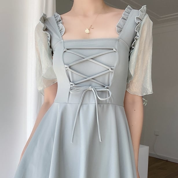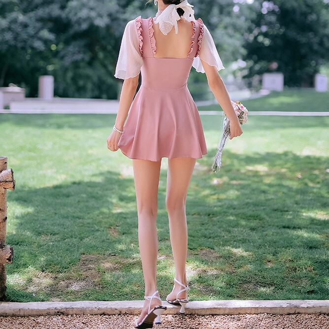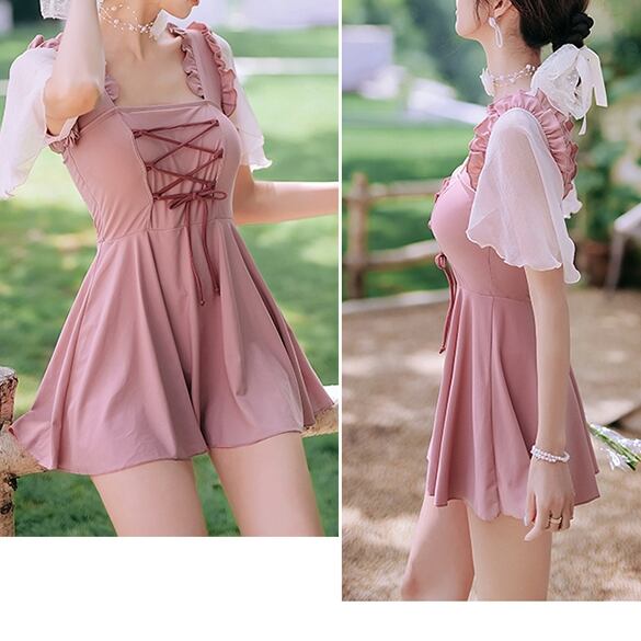 フリル袖&レースアップでキュートに魅せるワンピース水着。