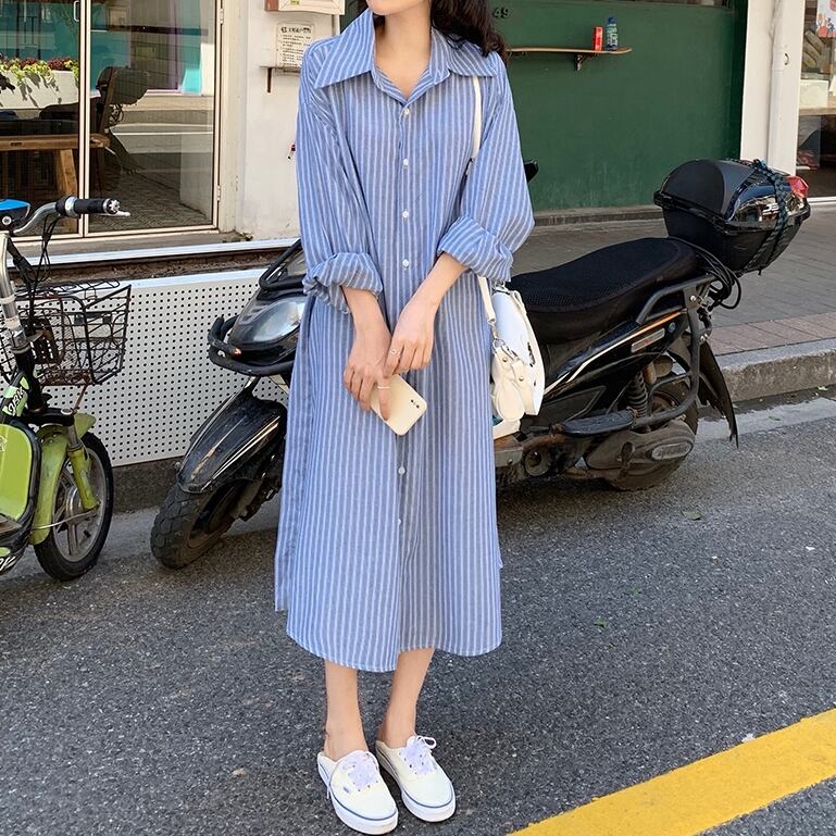 商品名:ウエストリボン ストライプ ロング シャツワンピース