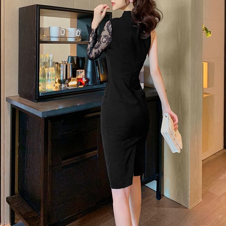 商品名:シースルー レース ハイネック タイトワンピース ドレス