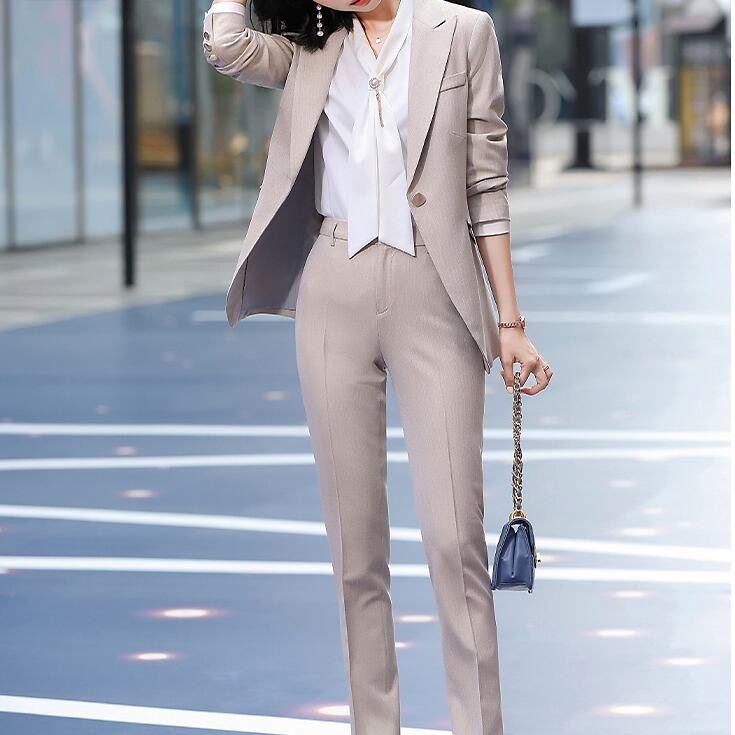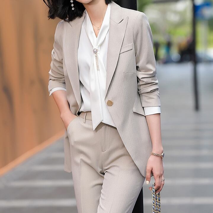 ジャケットとパンツのパンツスーツ。