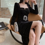 ワンピース レディース ミモレワンピース ロング ミモレ丈 ドット柄 パフスリーブ スクエアネック ブラック 黒 ドレスワンピース ひざ丈 ひざ下 ワンピースドレス 春 夏 春夏 お呼ばれ パーティー ドレス ロングワンピース C-OAW1037