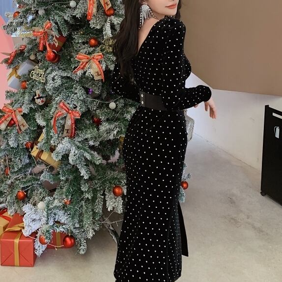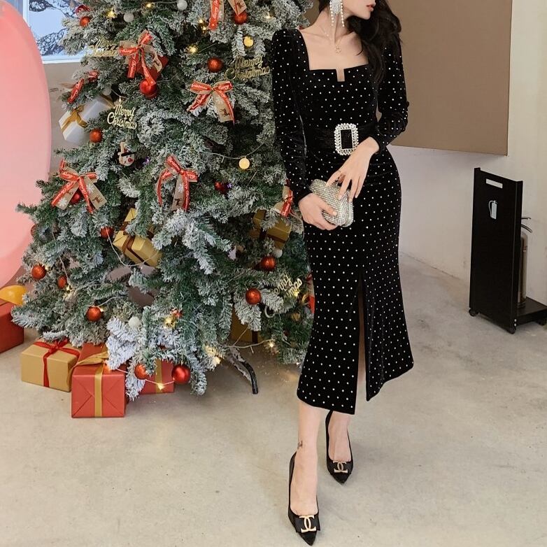 商品名:ドット柄パフスリーブ&スクエアネック ロングワンピース