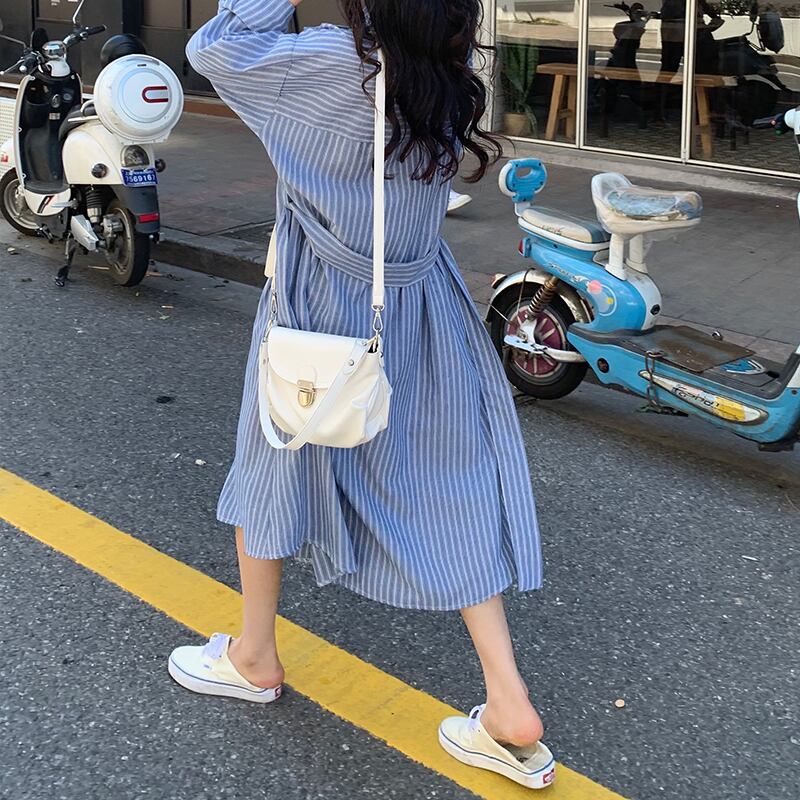 商品名:ウエストリボン ストライプ ロング シャツワンピース